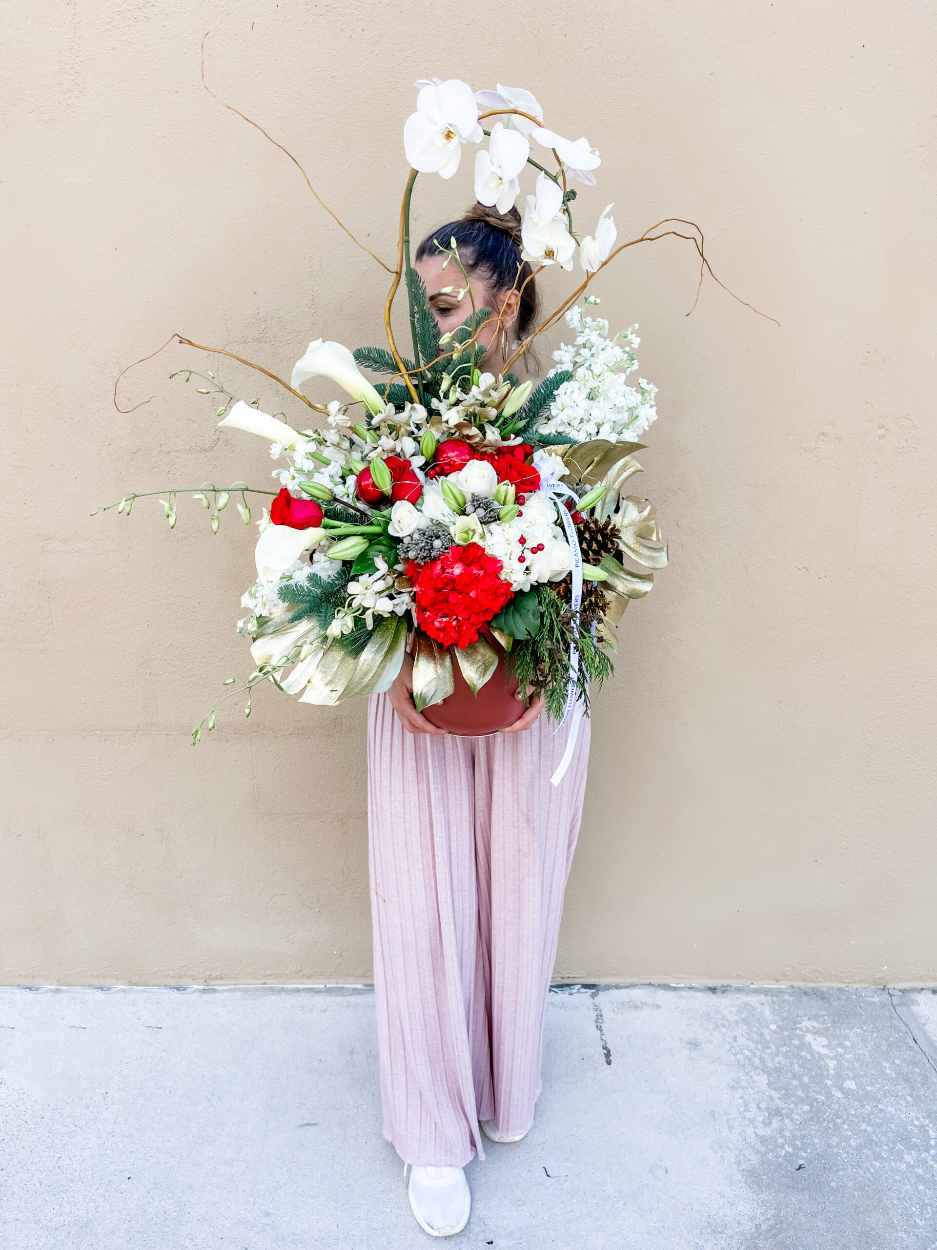 An opulent holiday statement arrangement designed for those who appreciate refined luxury and dramatic floral artistry. This grand design features cascading white Phalaenopsis orchids rising above a lush composition of red hydrangea, white hydrangea, elegant calla lilies, fragrant stock, and delicate dendrobium orchids. Accents of silver brunia, winter evergreens, pinecones, and seasonal berry stems add rich texture and depth throughout the arrangement.